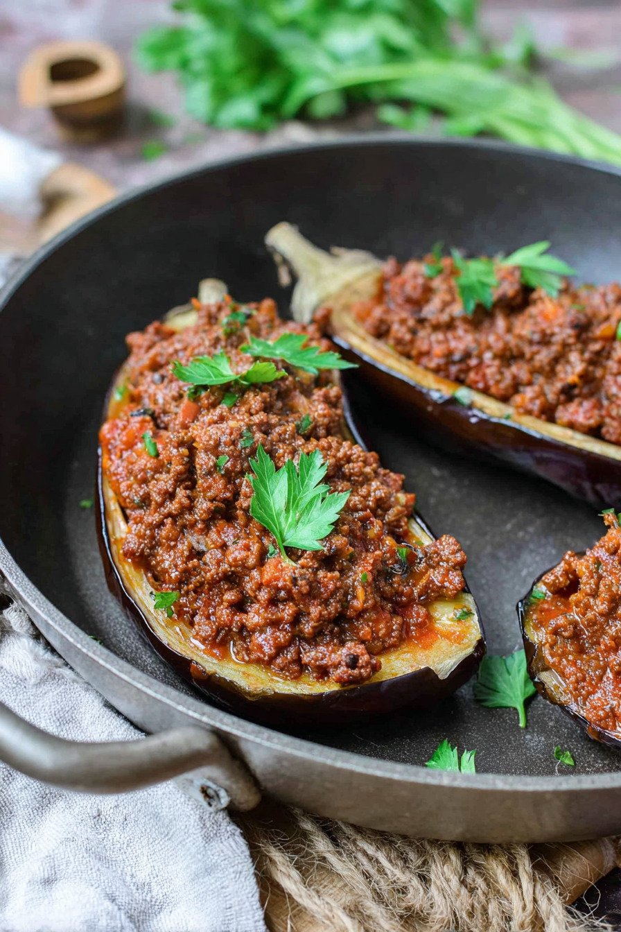 Wir arbeiten mit Hitze aus dem Ofen. Die Aubergine entspannt sich dort. Das Fruchtfleisch gibt nach und nimmt die Fuellung gern auf. In der Pfanne brate ich das Hack an. Zwiebel und Knoblauch duften. Tomaten bringen Saft und kleine Stuecke. Ein Loeffel Tomatenmark gibt Tiefe. Am Ende kommt Petersilie fuer etwas Gruen dazu. Alles zusammen fuehlt sich rund und ehrlich an.