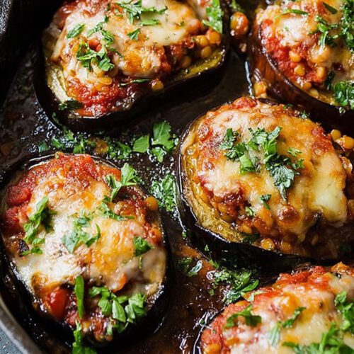 9 Gefüllte Auberginen mit Linsenbolognese