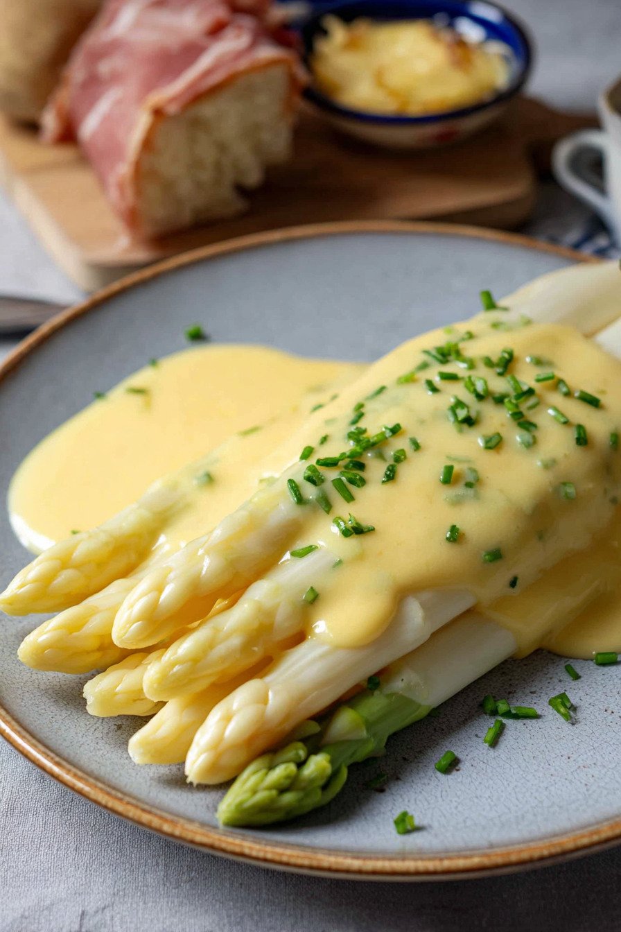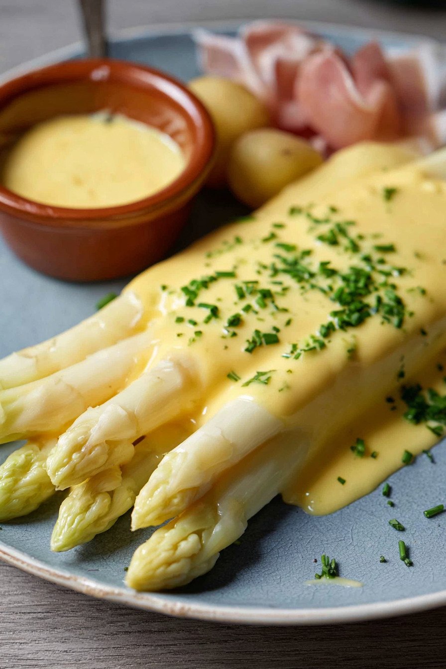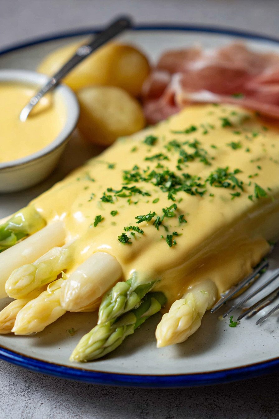 Warm water One spoon of warm water helps the yolks blend smooth. It keeps the texture light and friendly. It makes the sauce easy to spoon over delicate fish or spears of Spargelsauce moments.