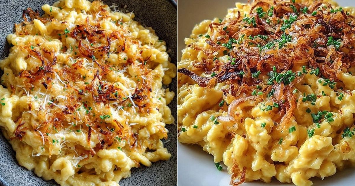 Einfache Gerichte Käse Spätzle mit goldenen Röstzwiebeln