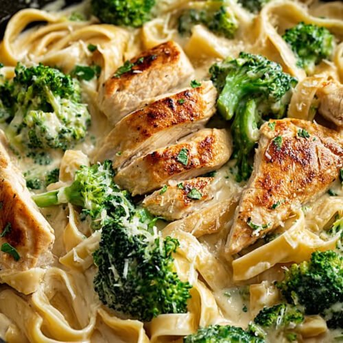 I make this creamy pan when I crave comfort and I want dinner to feel easy. Tender chicken meets bright broccoli in a soft coat of Parmesan cream. The pasta soaks it up and the whole bowl tastes warm and kind. We cook fast and clean. I chop the chicken into small bites so it sears well. I steam the broccoli till it turns a gentle green and still keeps a little snap. Garlic opens in butter then cream joins and the cheese melts smooth. The sauce hugs each noodle and the bowl goes quiet. This works for busy nights and lazy Sundays alike. Kids like the mellow flavor and we grown ups get real comfort. On Emilia Rezepte we love Familienessen rezepte and this one wins often. It also fits Broccoli Salat Rezepte Chicken Rezepte Alfredo Soße Rezept Gesunde Familienessen Chicken Curry Rezepte and Chicken Burger Rezepte. Grab a pot a pan and a wooden spoon. Dinner is close.