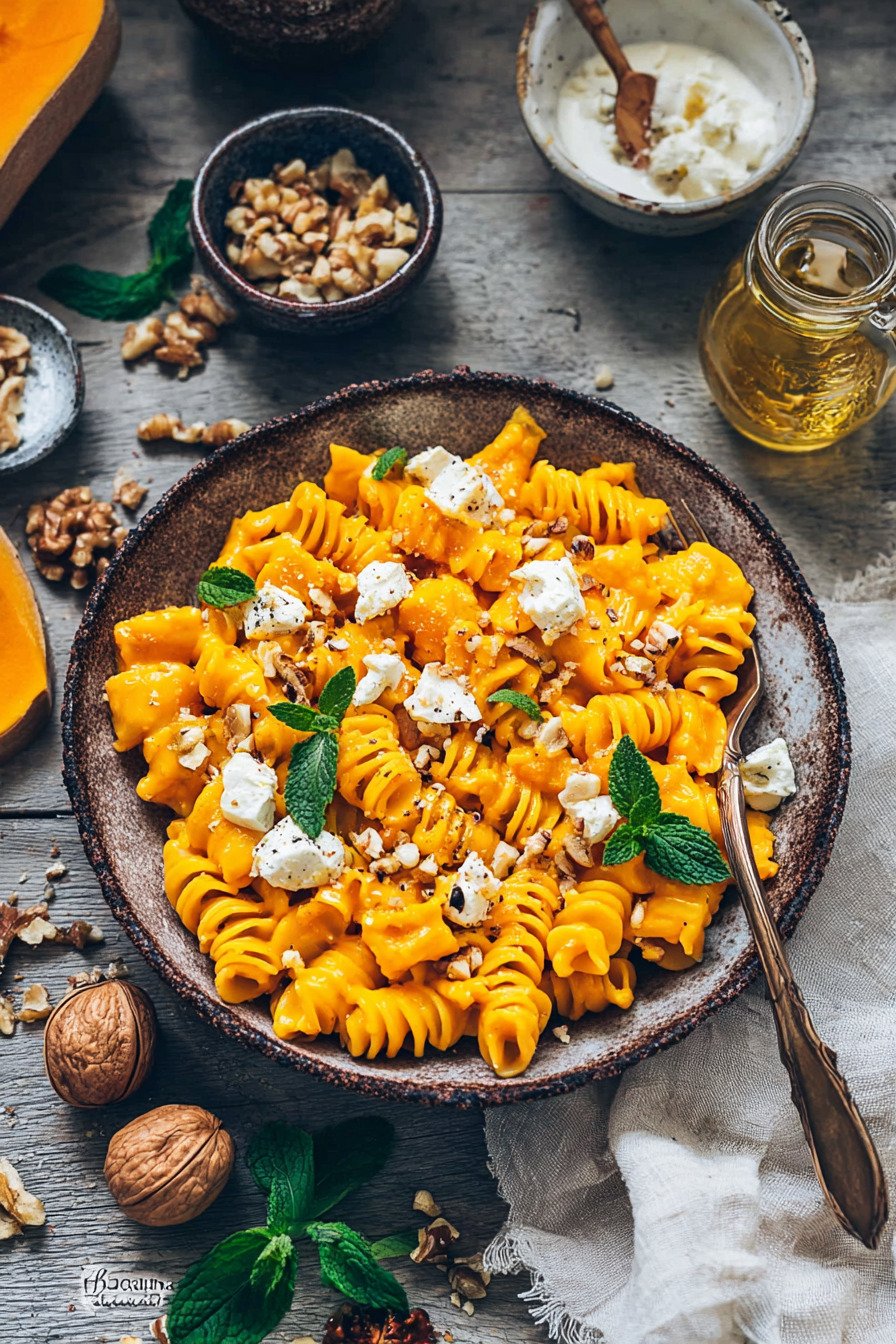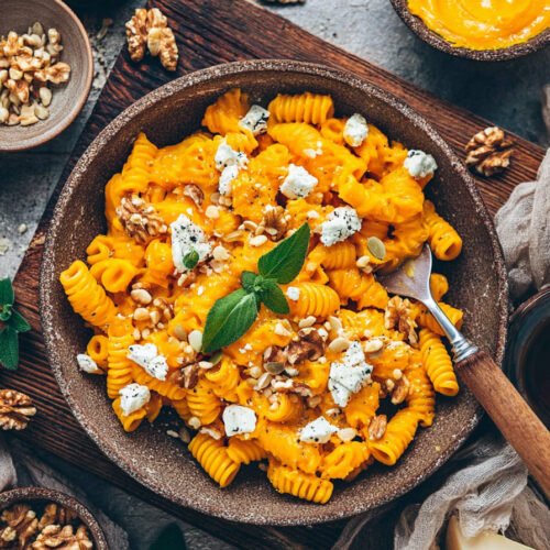 Wenn du auf der Suche nach köstlichen Vegetarische Rezepte Einfach bist, dann wirst du diese cremige Pasta mit Kürbis-Sauce lieben. Dieses Gericht vereint alles, was man sich von Vegetarische Pasta Rezepte wünscht: eine samtige Sauce, aromatische Zutaten und eine unkomplizierte Zubereitung. Perfekt für alle, die schnelle und leckere Pasta Rezepte Vegetarisch genießen möchten. Diese Vegetarische Pasta überzeugt mit einer harmonischen Kombination aus süßlichem Kürbis, würzigem Feta und knackigen Walnüssen. Gerade wenn du Pasta Rezepte Einfach suchst, die dennoch besonders schmecken, ist dieses Gericht ideal. Auch Fans von Reis Rezepte Vegetarisch werden hier eine tolle Alternative finden, die ebenso sättigend und vielseitig ist. Ob für ein entspanntes Abendessen oder als Highlight unter den Einfache Gerichte Vegetarisch – diese Pasta passt immer. Sie zeigt, dass Vegetarische Rezepte Einfach nicht langweilig sein müssen, sondern voller Geschmack und Genuss stecken können. Lass dich inspirieren und bringe frischen Wind in deine Küche!