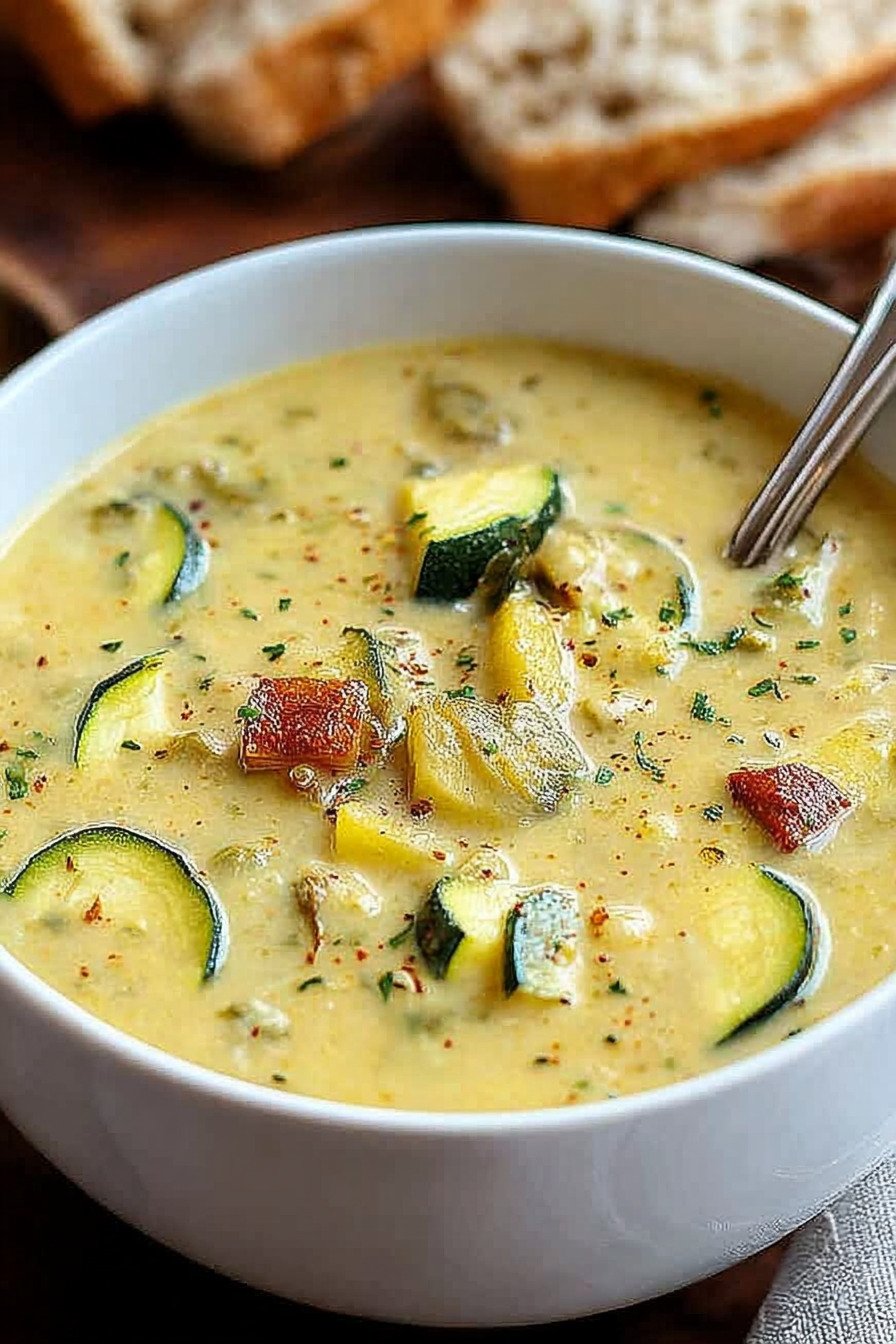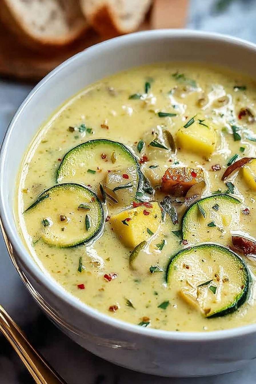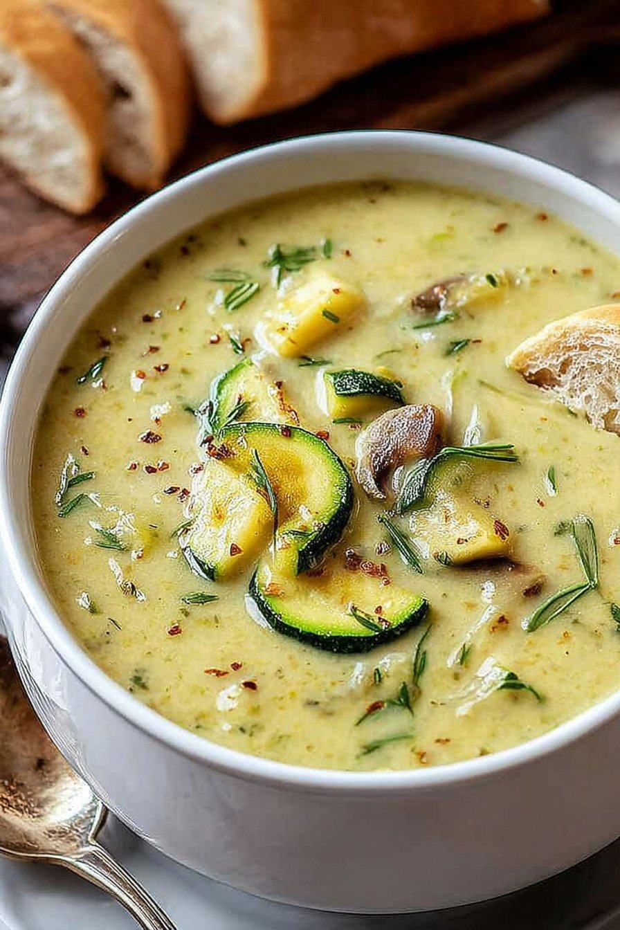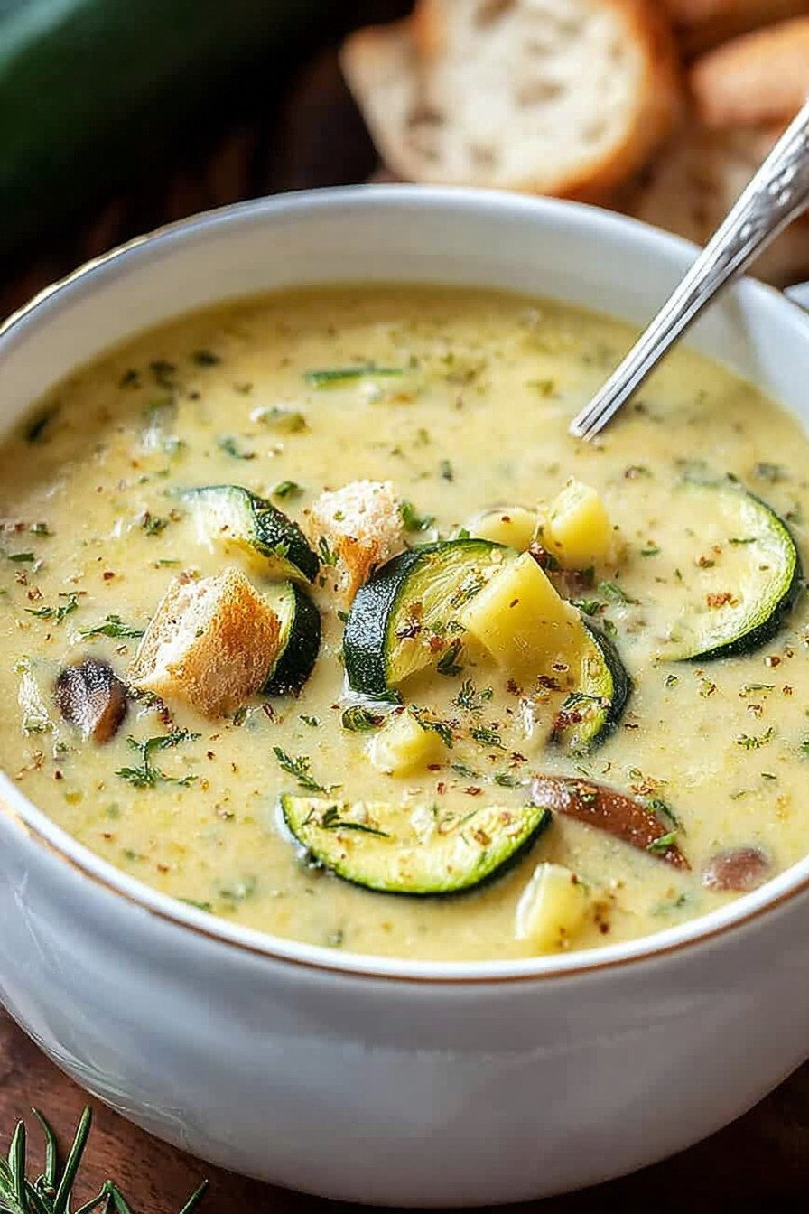 Soft zucchini leans into onion and garlic. Potato adds grip so the blend sits smooth. A splash of cream rounds the edges. Fresh lemon wakes the bowl. Bread on the side gives crunch. This fits Zucchini soup lovers who crave a creamy soup without weight.