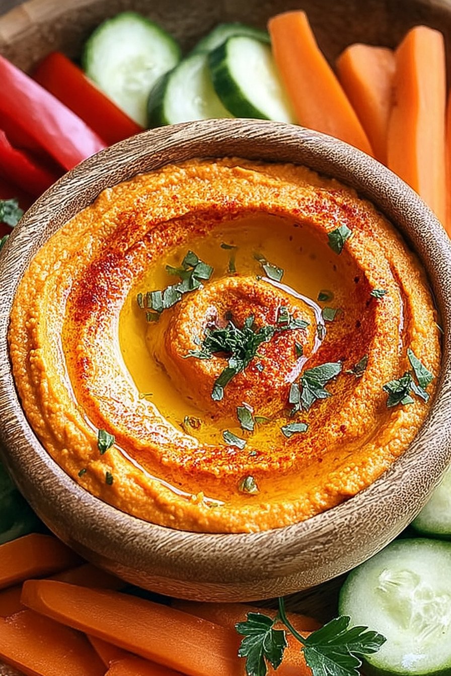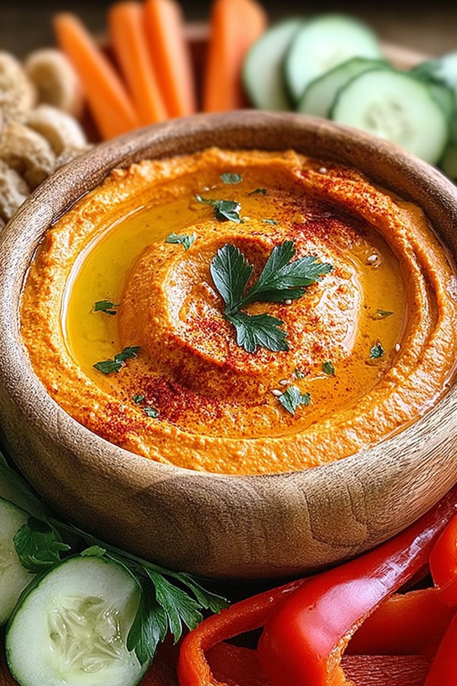 We roast sweet red peppers and fold them into a cool creamy base. The mix tastes bright and smooth. Friends hover near the bowl and pretend to talk while they scoop more.