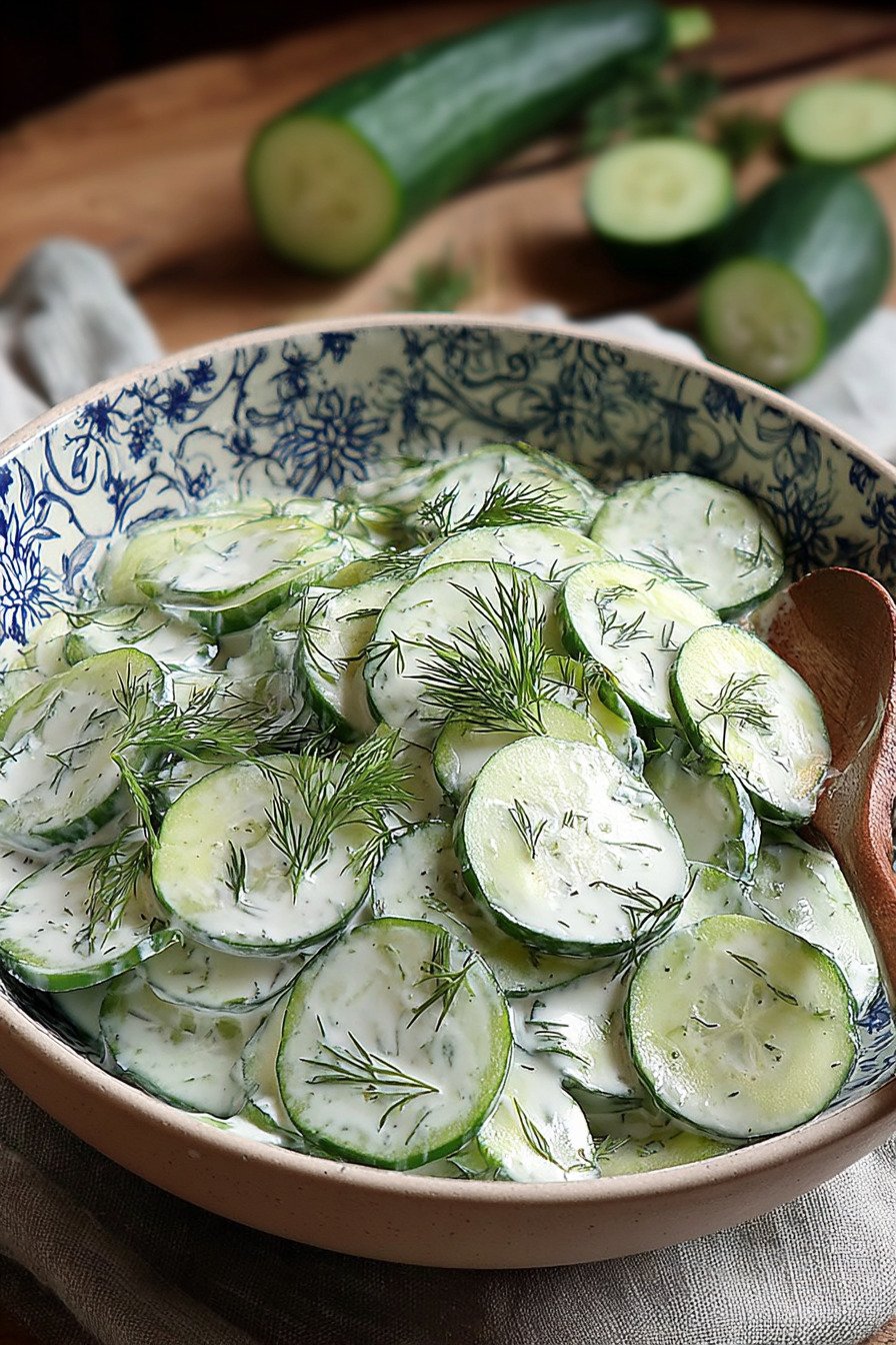 Cucumbers I like firm and fresh ones with cool skins and a clean scent when sliced. Thin rounds catch the dressing and keep snap in each bite. If seeds run big I scoop a little so the bowl stays crisp.