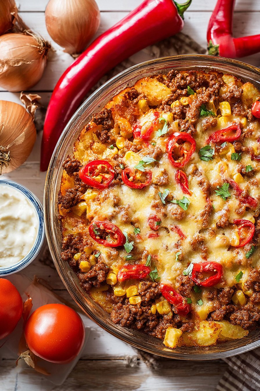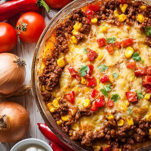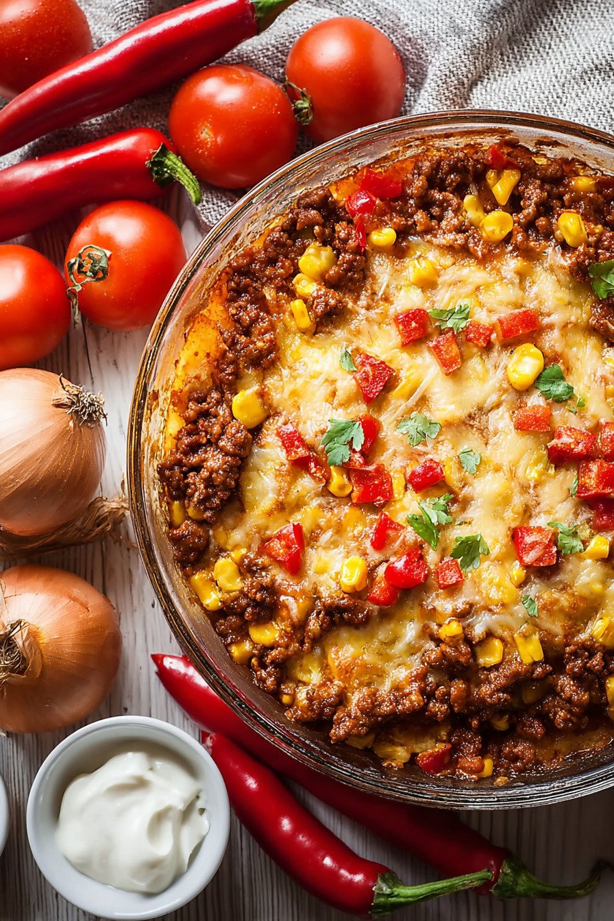 Think of it as one of those potato casserole recipes that knows how to behave. The layers stay neat. The edges crisp. The middle stays creamy. I like that balance. It has bright corn and peppers that pop like tiny confetti. The beef brings a savory base note. A squeeze of lime wakes it all up without stealing the show.