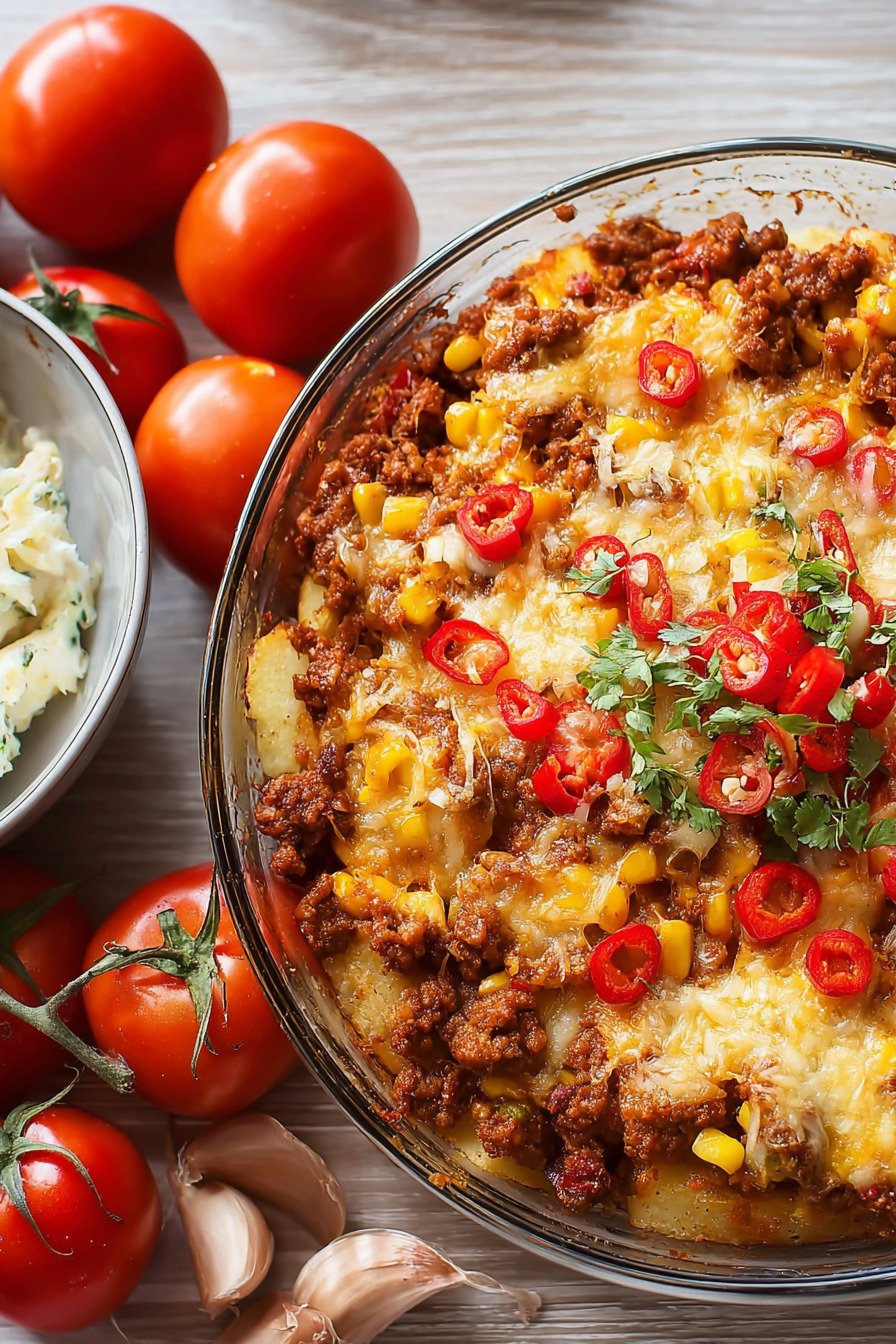 The base gives you potato comfort with juicy beef and bright veg. Cheese melts into a soft top that bubbles and browns. The sauce leans on tomatoes with a hint of lime. Every bite feels warm and a little sunny.