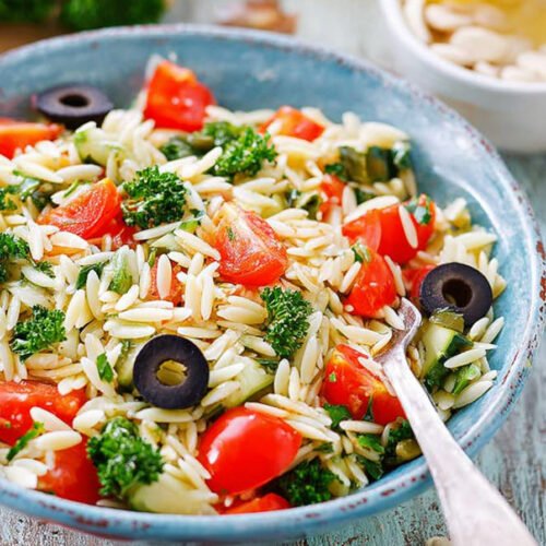 Step six rest and serve Let the salad sit for ten minutes so flavors settle. Spoon into a wide dish and serve. This kritharaki pasta salad with feta travels well and plates clean.