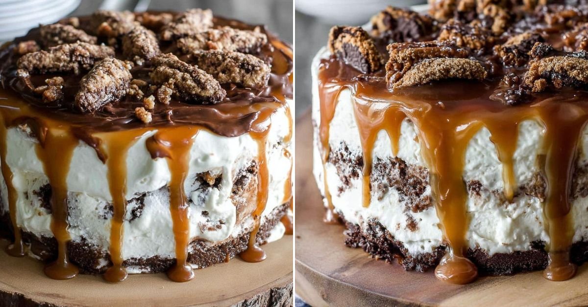 Diese herrliche Eiscreme-Torte kombiniert cremige Vanilleeis-Schichten mit knusprigem Schokoladenkeksboden und süßem Karamell – perfekt für heiße Tage!