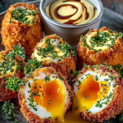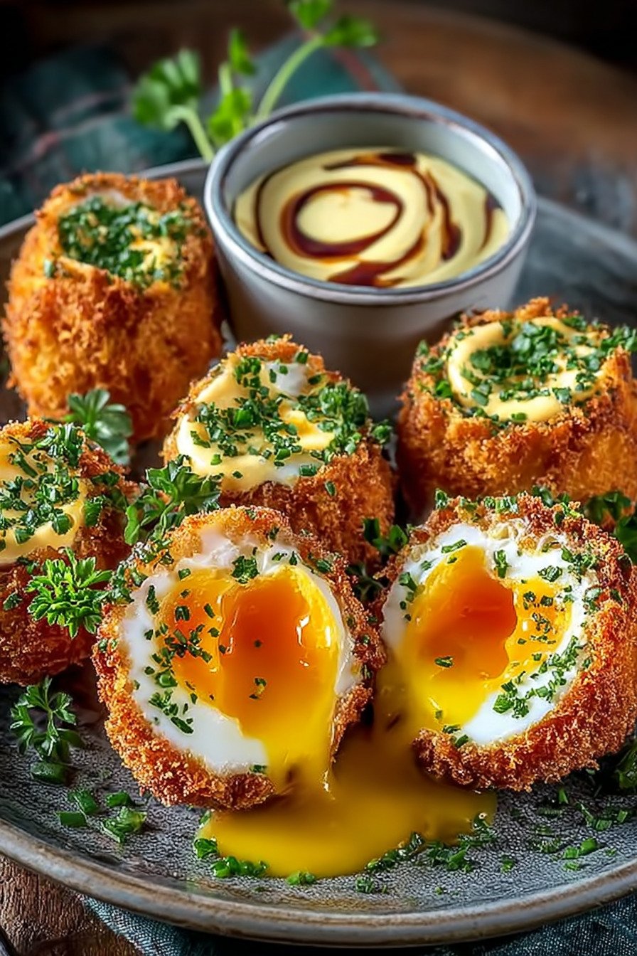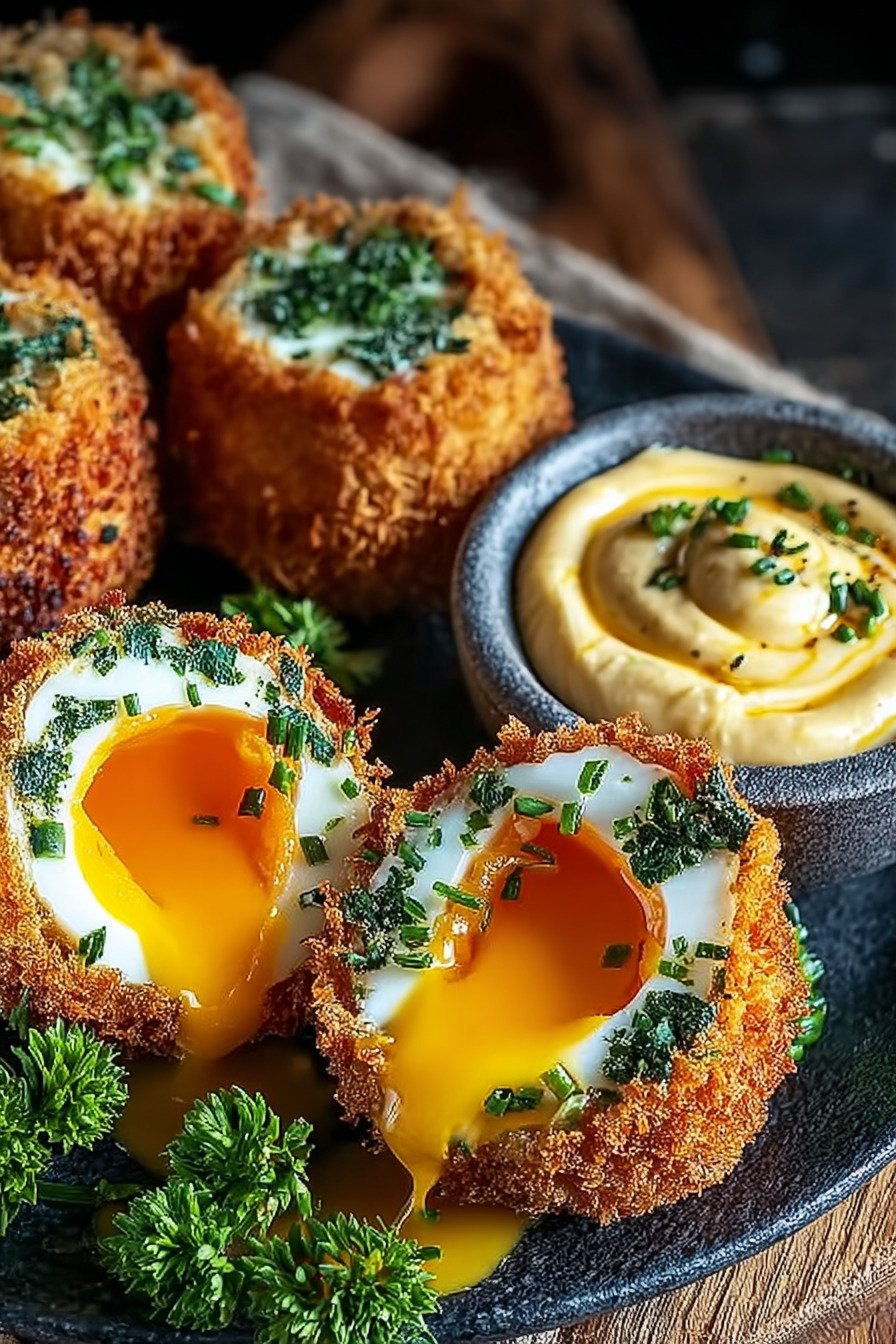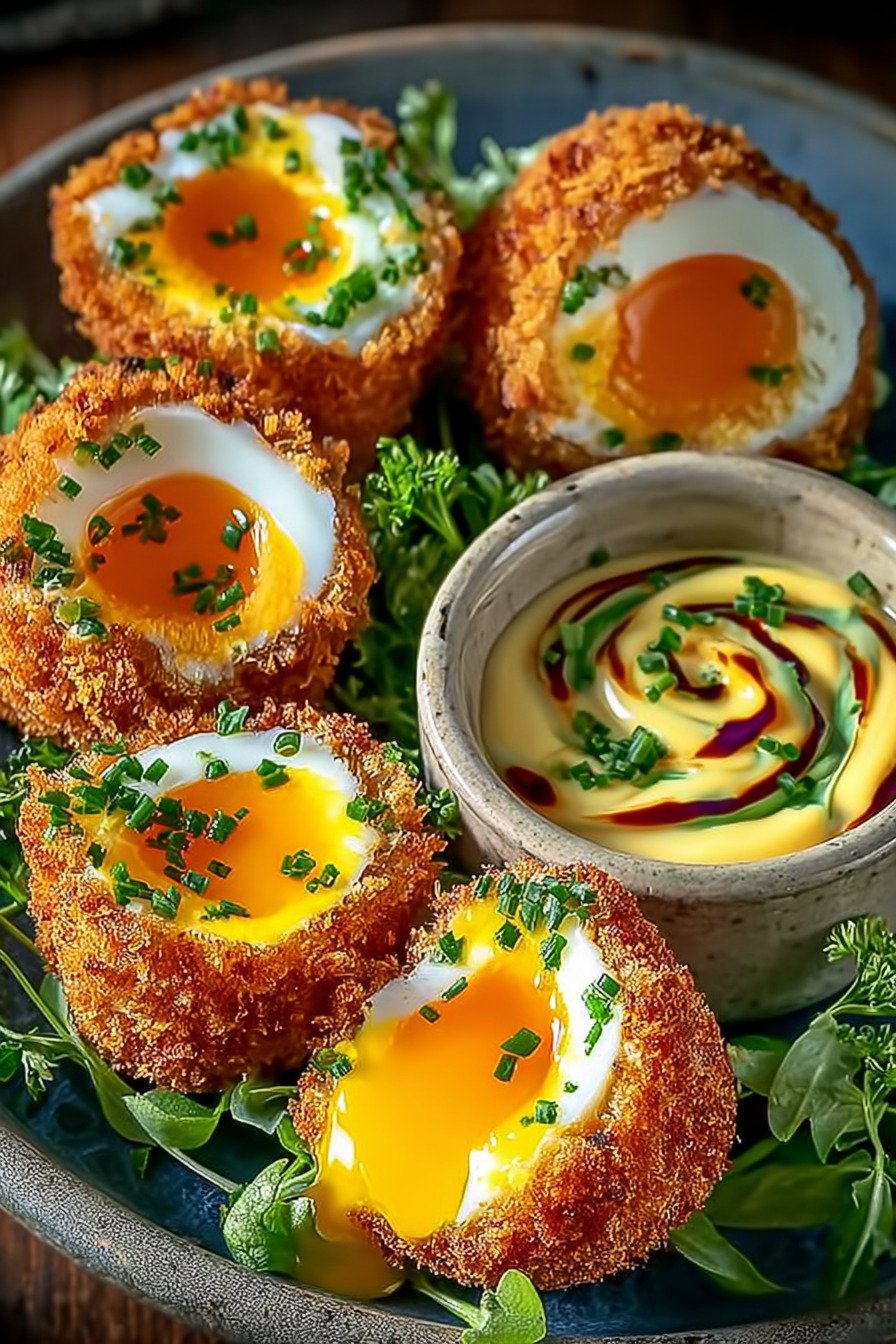 Ich koche die Eier, pelle sie, paniere sie und brate sie kurz. Wir lachen, weil es so einfach wirkt. Die Panade knackt. Das Eigelb glänzt. Dazu Dip und ein paar Kräuter. Fertig wird ein Teller, der satt macht und leicht bleibt.