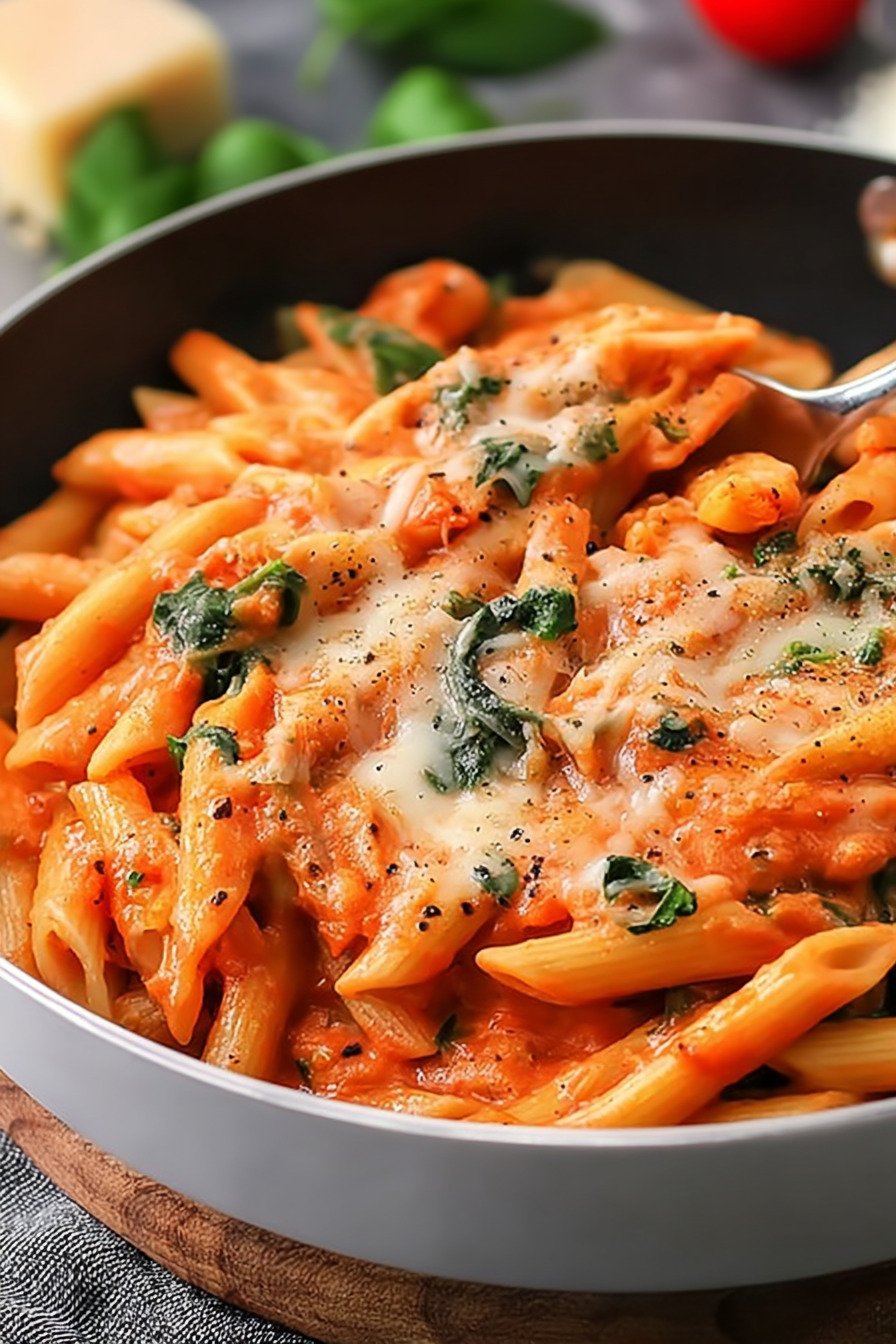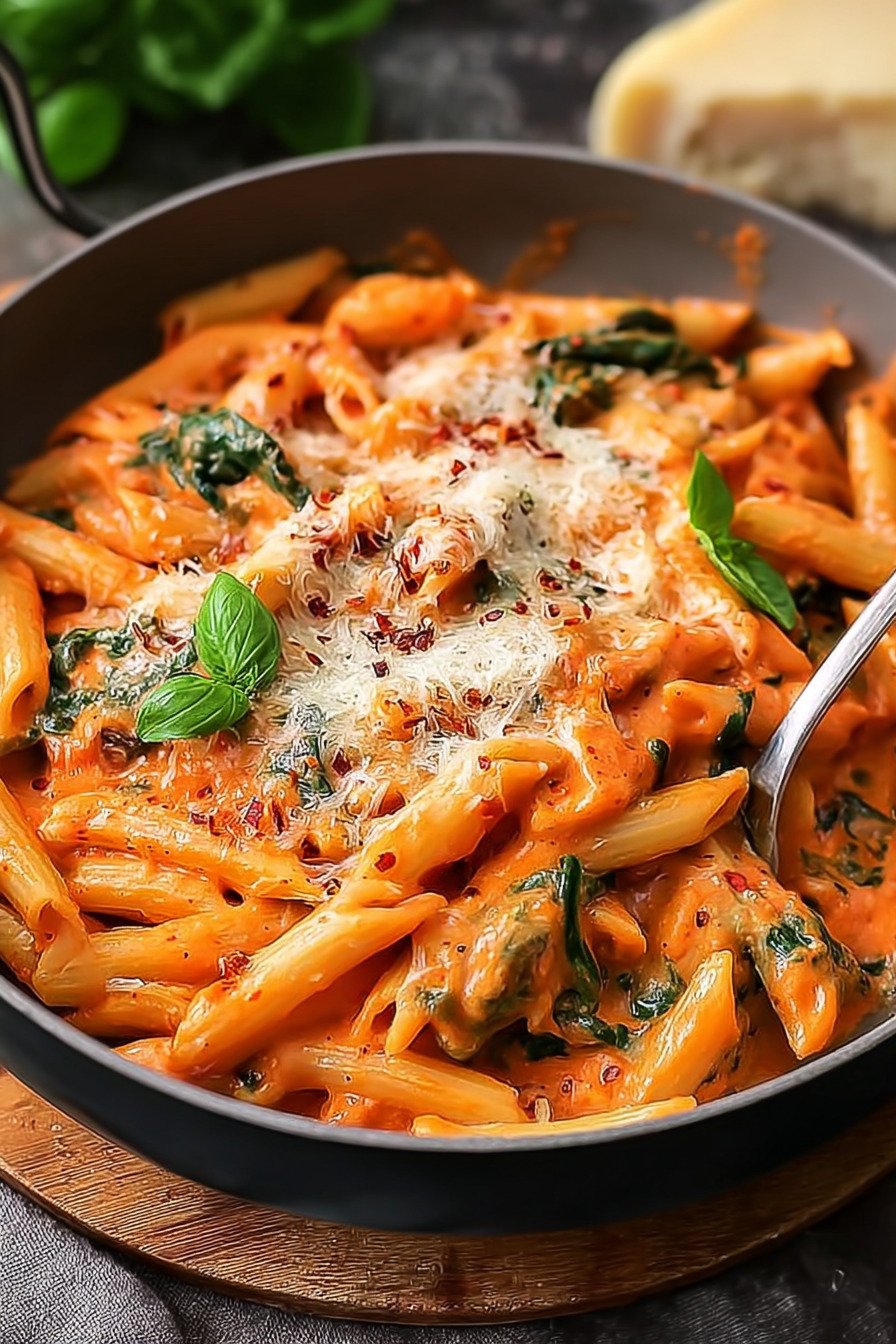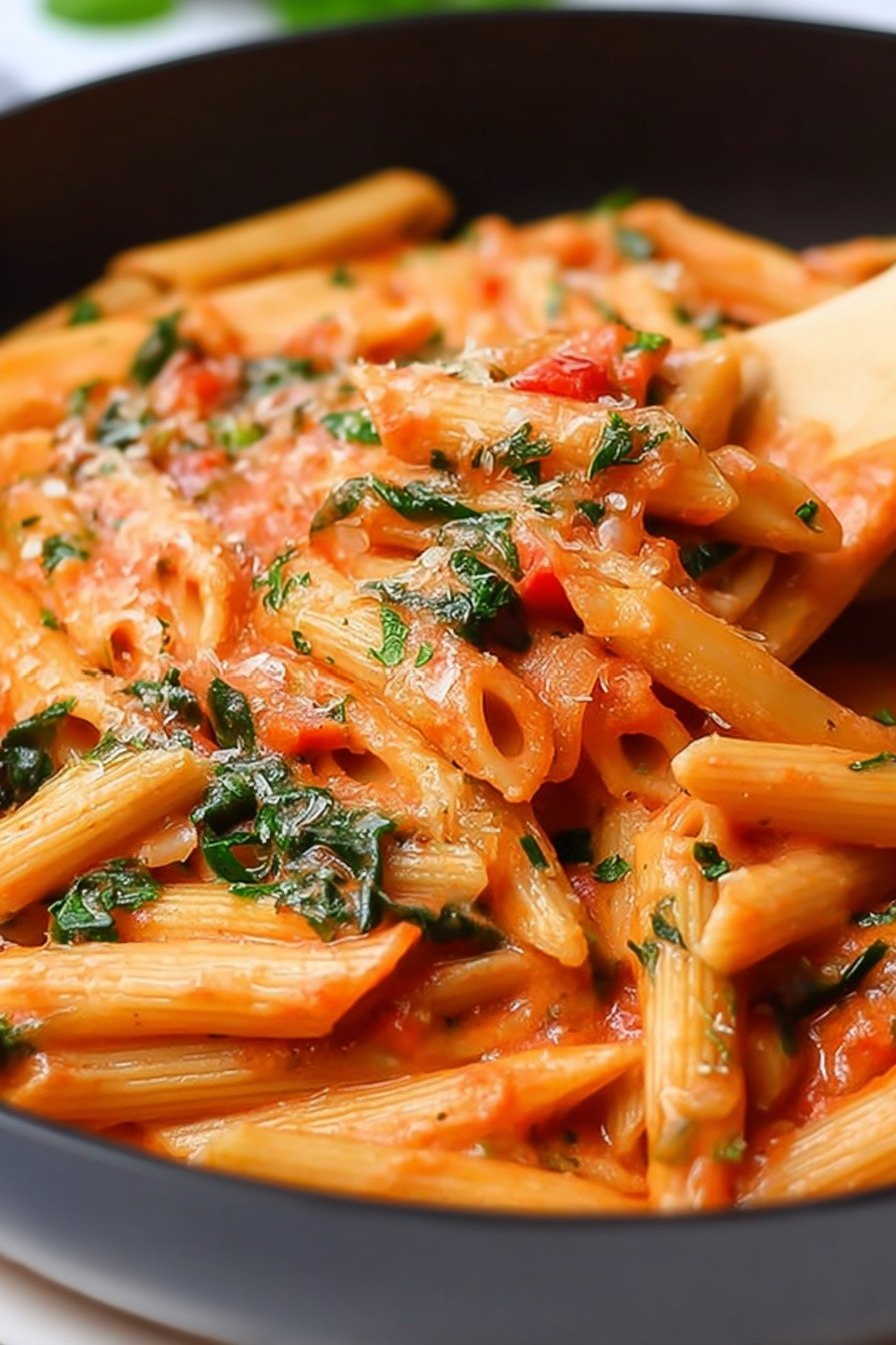 Wir nutzen Penne mit Rillen. So hält die Sauce gut. Die Tomate schmeckt reif, die Sahne rundet ab. Paprika gibt Süße und etwas Biss. Spinat fällt kurz in der Pfanne zusammen und bleibt grün.