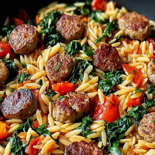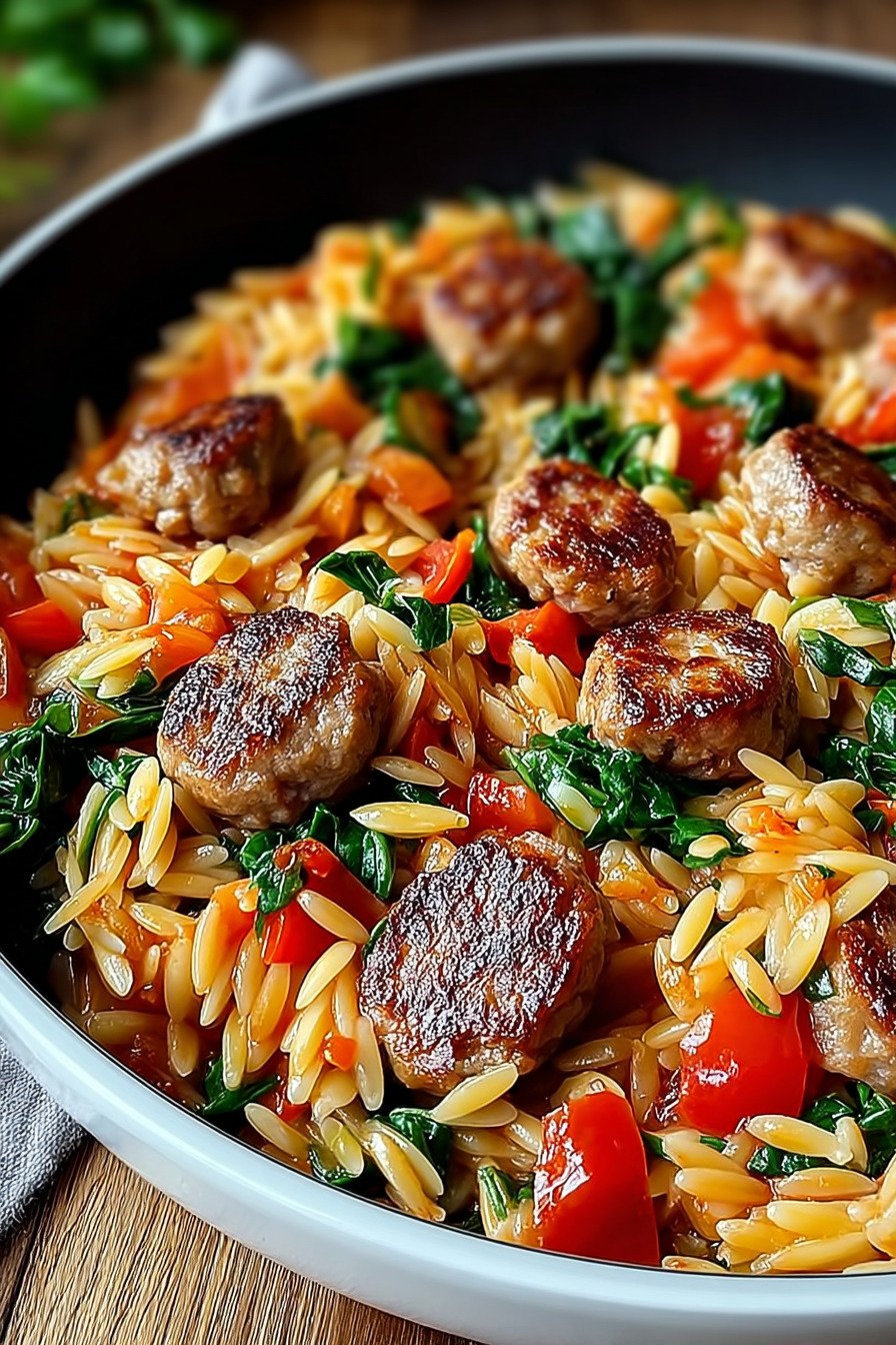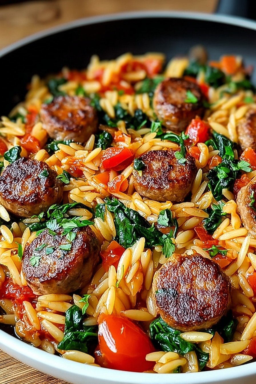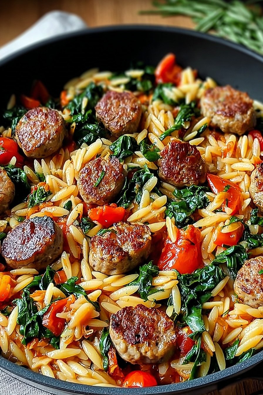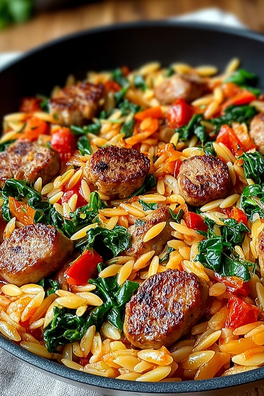 - One skillet cooks tender orzo with browned sausage and sweet peppers for a weeknight win.