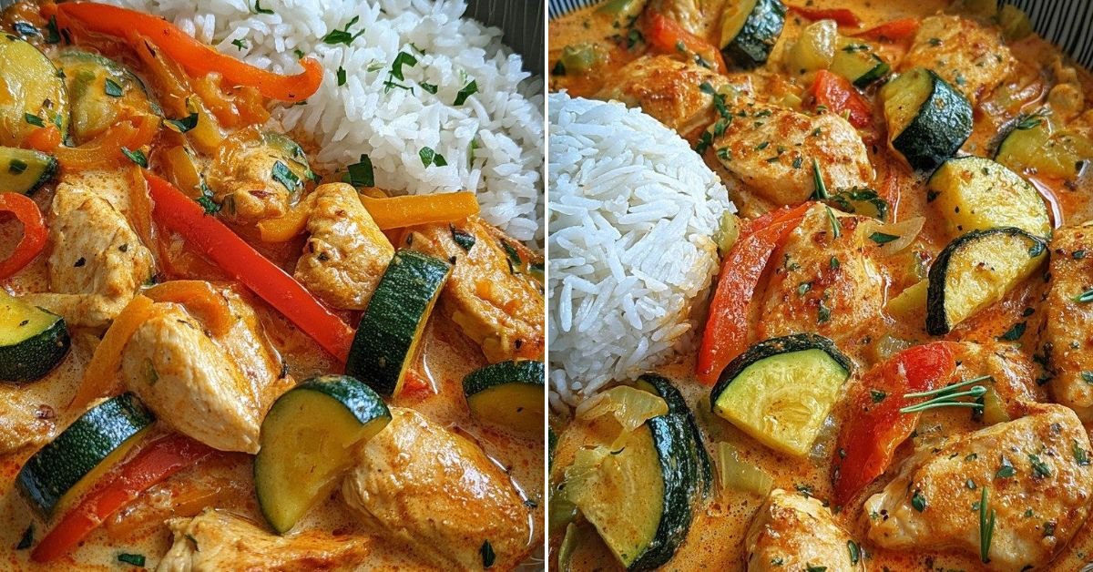 Die Zubereitung erfordert kein besonderes Können, sondern nur frische Zutaten wie Paprika und Zucchini. Zusammen mit Hähnchen und einer cremigen Sauce wird daraus ein harmonisches Zusammenspiel.