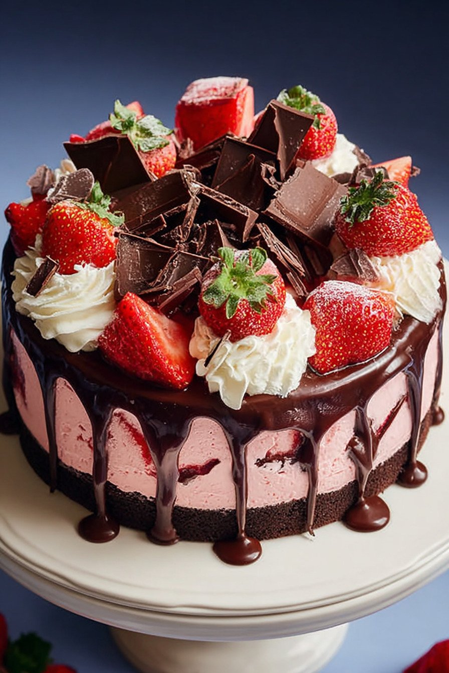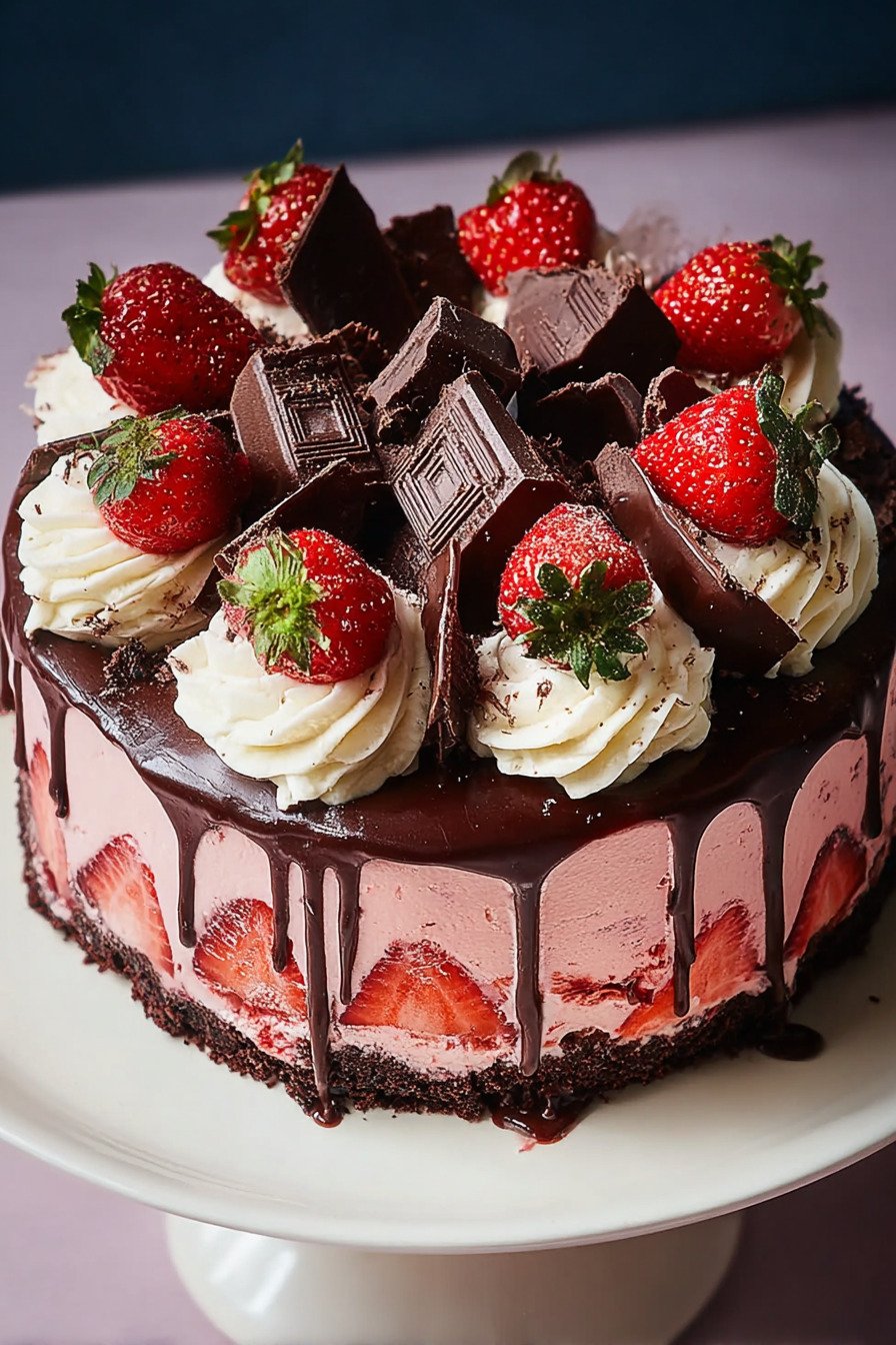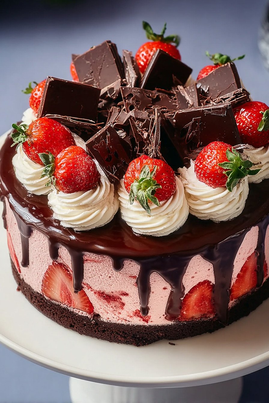 One neat slice offers a balanced bite. Cocoa gives depth. Strawberries add bright notes and light juice. Cream brings a cool finish that softens the crumb and ties the layers. The portion satisfies without feeling heavy.