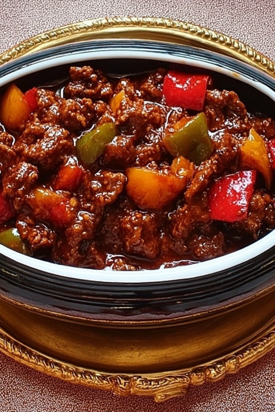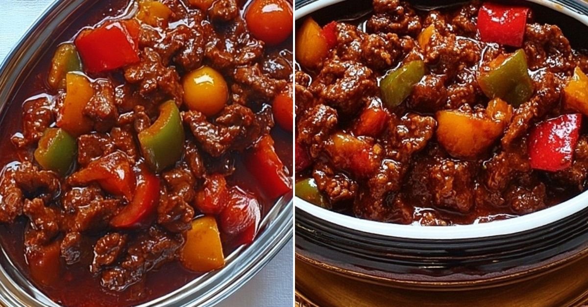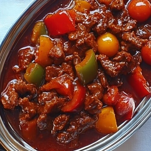 Ich ziehe das Fleisch in der warmen Soße kurz nach. So bleibt es weich. Wer mag hebt frische Paprika in die heiße Soße und bekommt noch Biss.