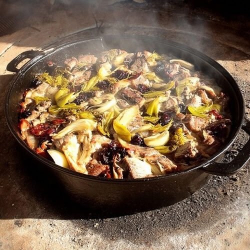 - Den Dutch Oven mit Deckel verschließen und bei indirekter Hitze (z. B. 9 Briketts unten, 15 Briketts oben) etwa 3 Stunden schmoren lassen.