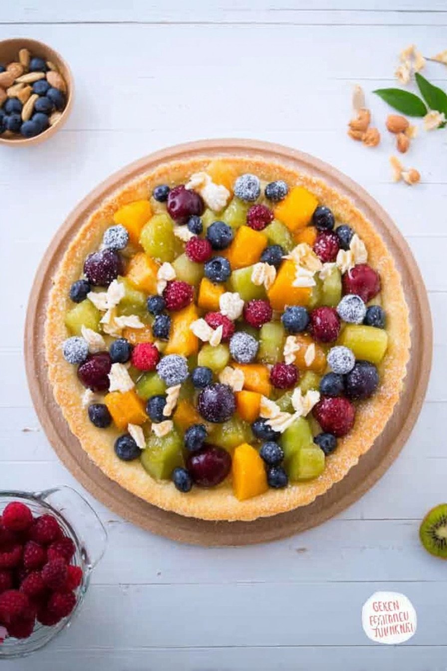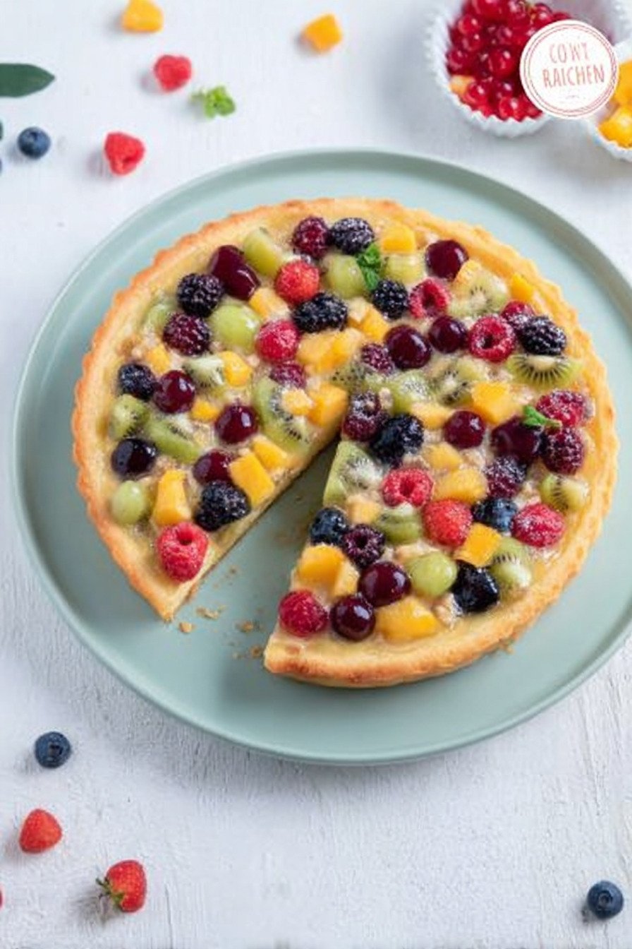 - Nach Wunsch mit Obst belegen. Wer mag, Tortenguss kochen und darüber geben.
