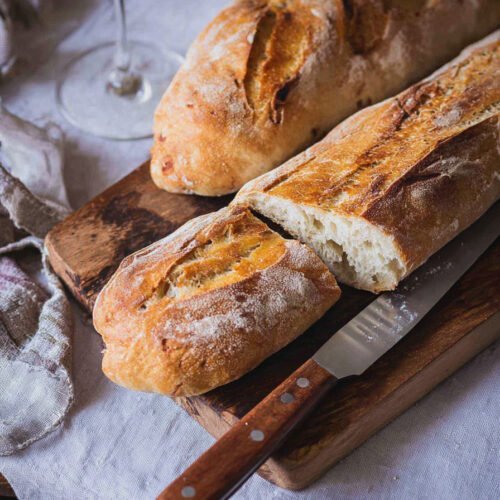 Wenn du für Gäste planst, kannst du das Baguette auch einige Stunden vorher backen und kurz vor dem Servieren im Ofen auffrischen. Dadurch wird die Kruste wieder knusprig und das Brot schmeckt fast wie frisch gebacken.