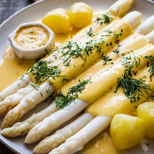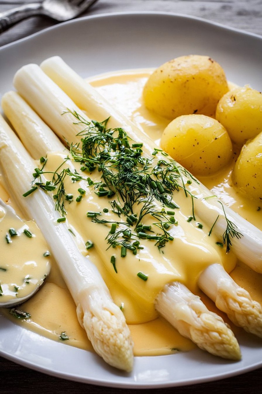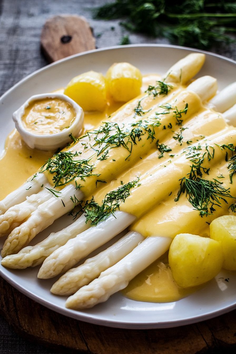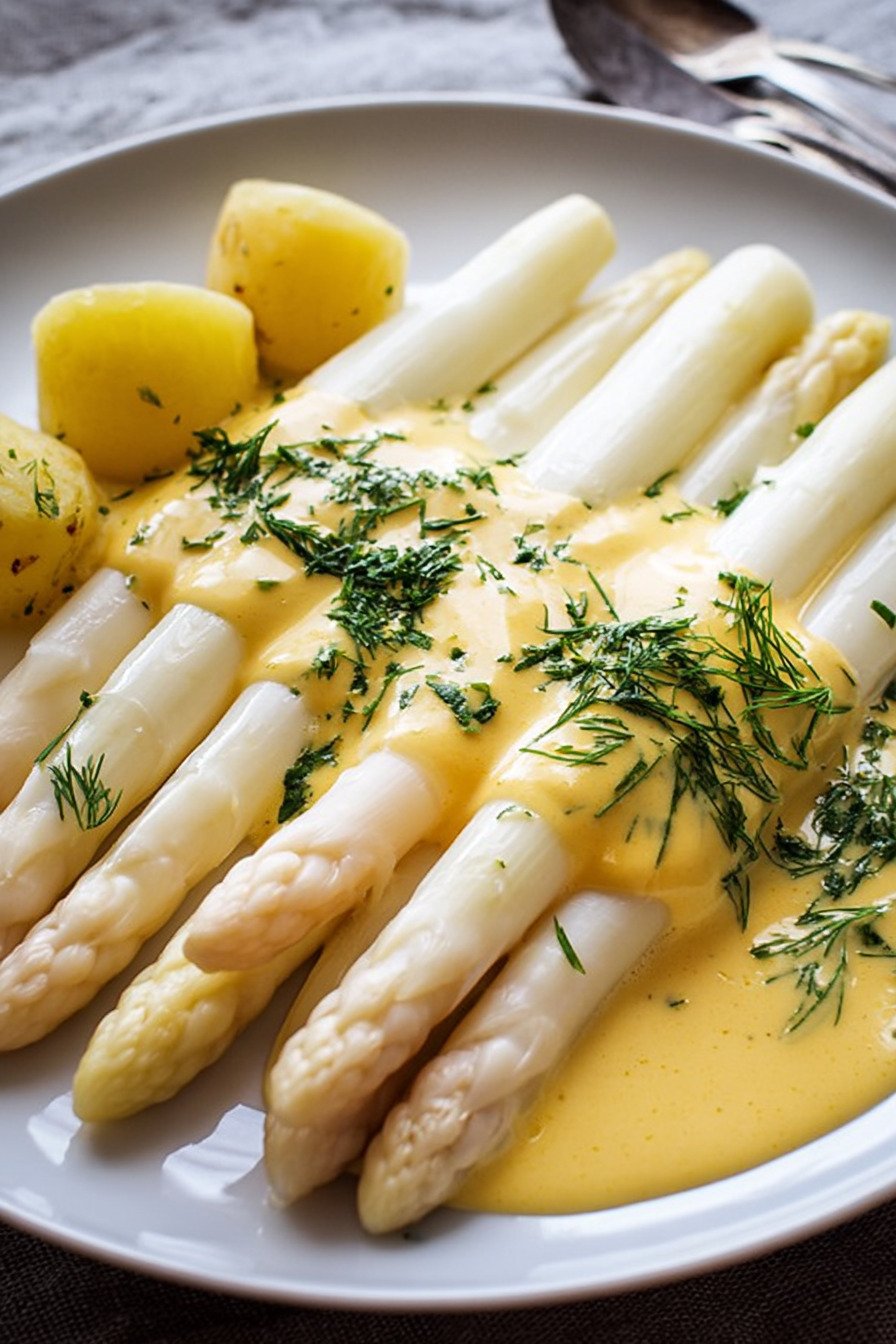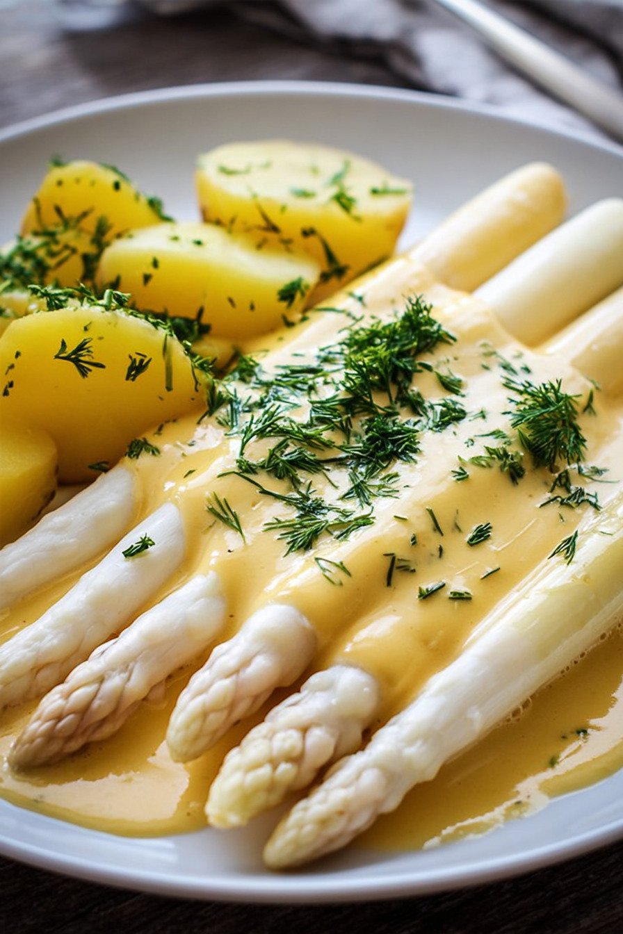 White asparagus with soft potatoes and warm Hollandaise feels like the moment when spring moves into the kitchen. I grew up with big Sunday plates of this, and I still get excited when I see the first bundles at the market and think about new spargel rezepte weisser for my table. For me this plate belongs in my list of Gerichte Mit Spargel that never fail. The spears stay tender, the potatoes taste comforting, and the rich sauce wraps everything in a smooth coat. It hits the same spot as Spargel Rezepte Vegetarisch that feel hearty without meat, so nobody at the table misses anything. We keep the sauce simple at home, more like Sauce Hollandaise Rezepte Einfach than a strict textbook version. I like that it works for busy days and still feels special. With good butter and a little lemon, the taste fits in the group of Spargel Rezepte Gesund, at least in spirit when I serve a crisp salad on the side. Leftovers never stay long. I often layer the extra spears and potatoes in a small Spargel Auflauf the next day and spoon on any Schnelle Hollandaise Sauce that survived dinner, which is rare.