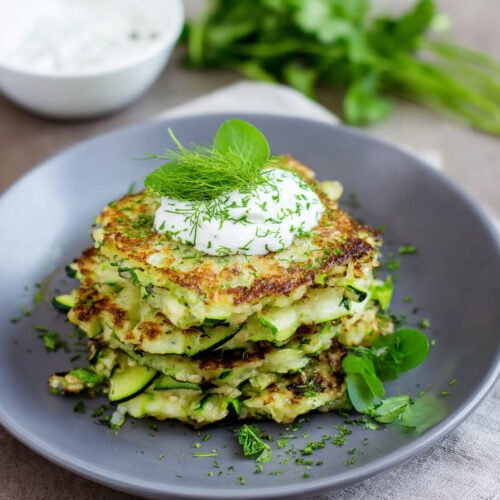 Zucchini waschen und grob raspeln. In ein Sieb geben, leicht salzen und 10 Minuten stehen lassen. Danach gut ausdrücken, damit die Puffer nicht zu wässrig werden.