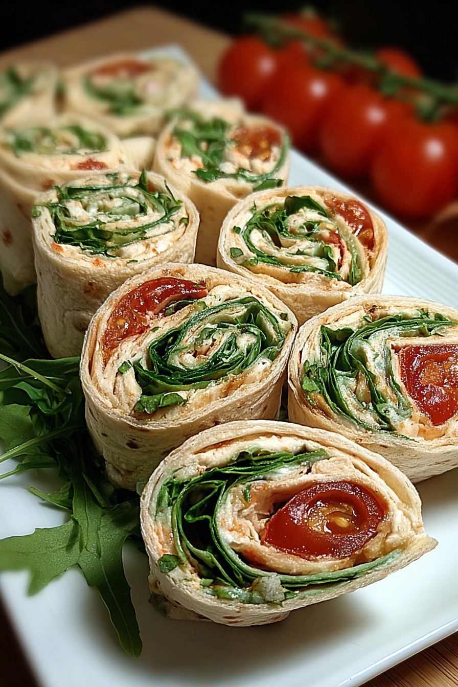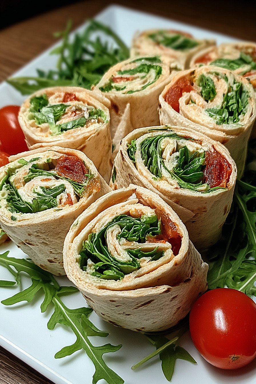 - 9) Vegetarische Wrap Röllchen mit Rucola und Tomaten