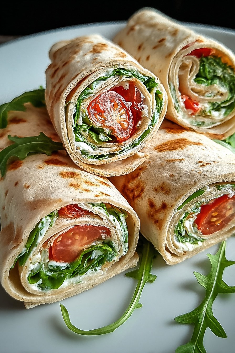 Die Rollen wirken leicht und eignen sich gut für eine kleine Mahlzeit. Rucola liefert frische Blattstoffe. Tomaten bringen natürliche Süße und Saft. Der Frischkäse ergänzt eine sanfte Proteinquelle.