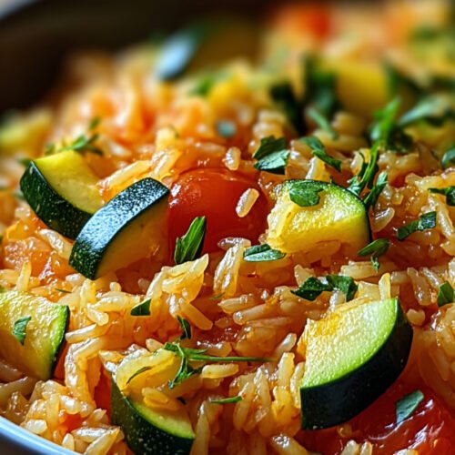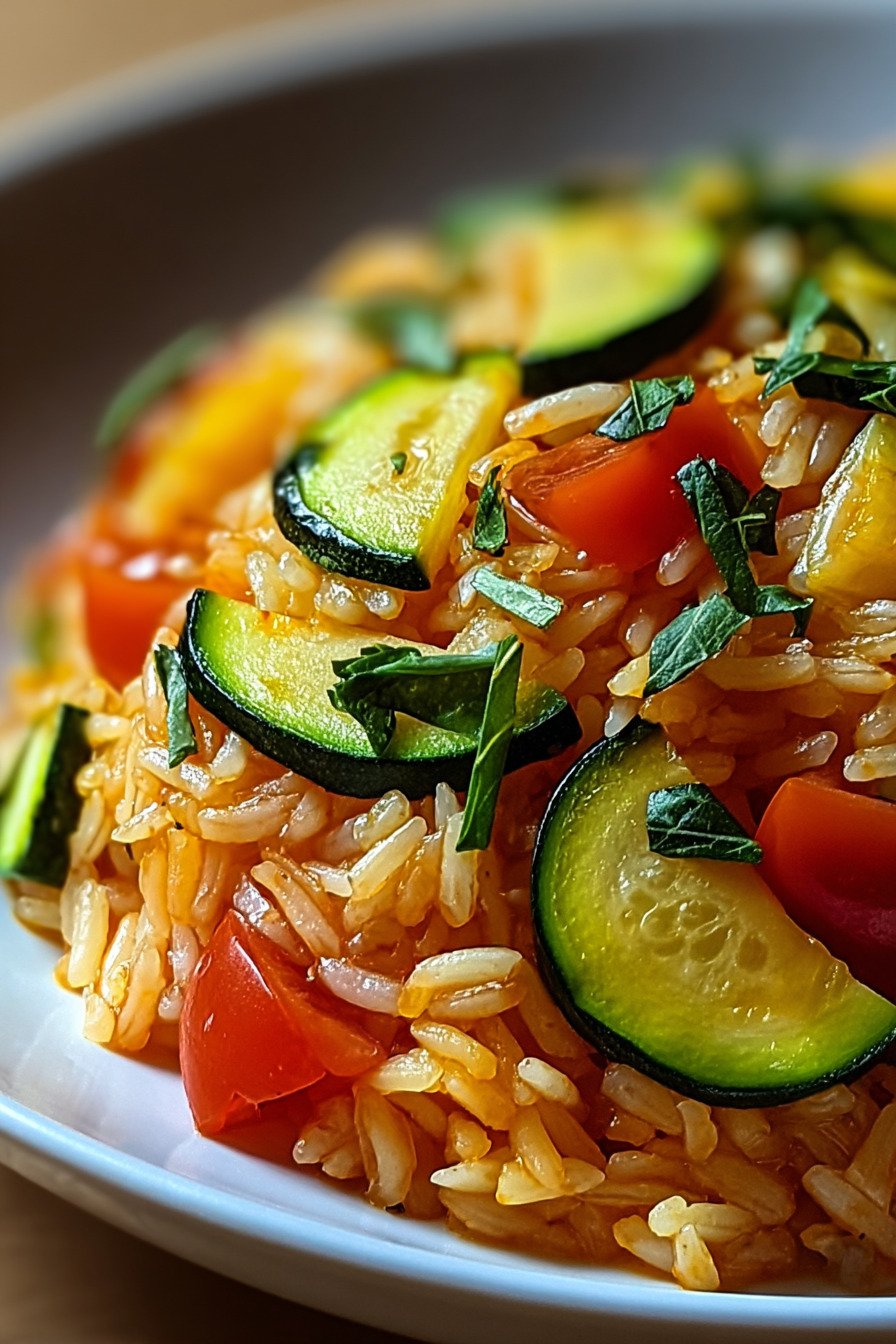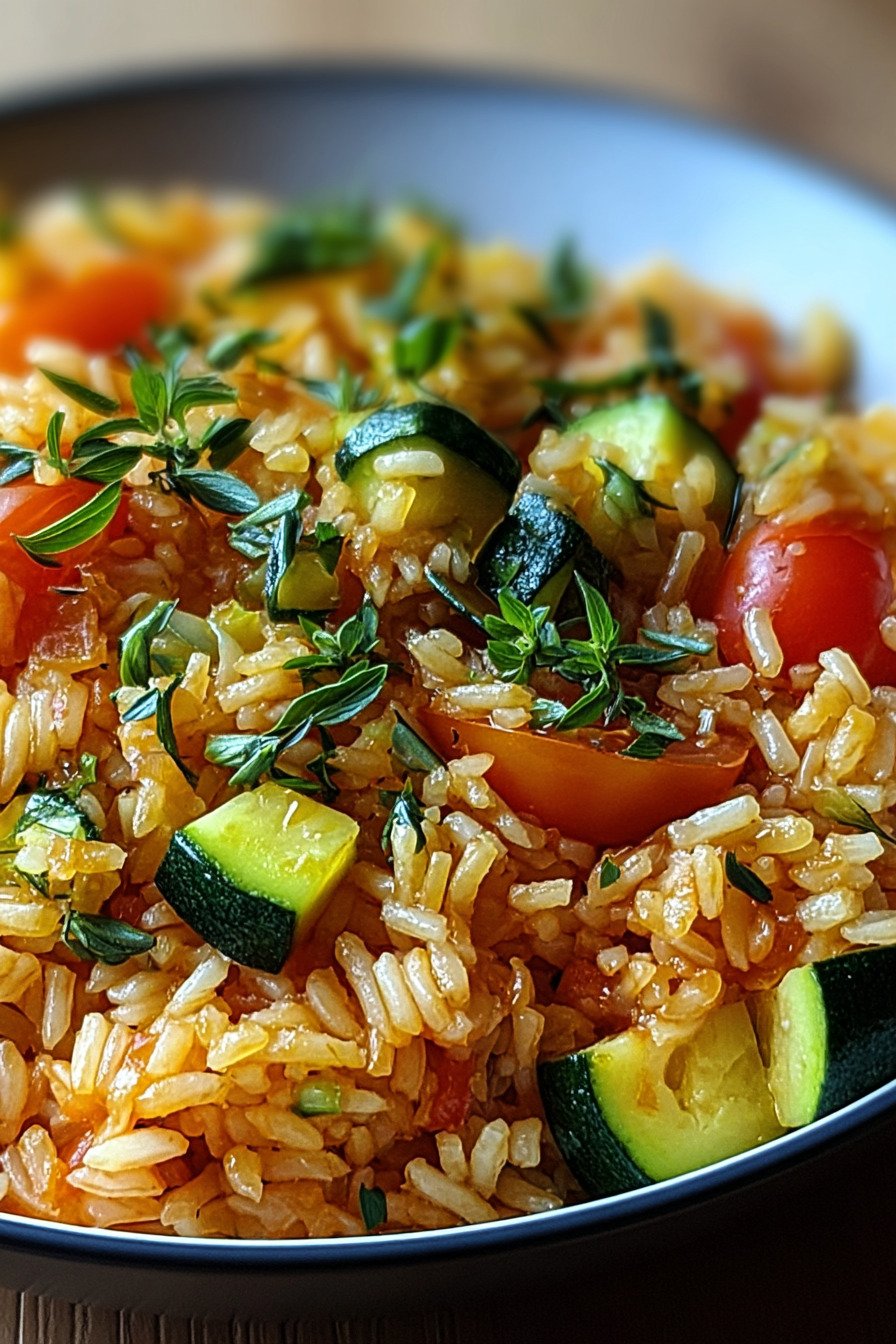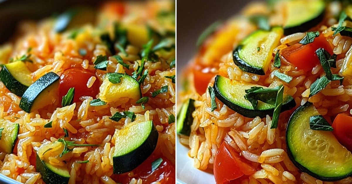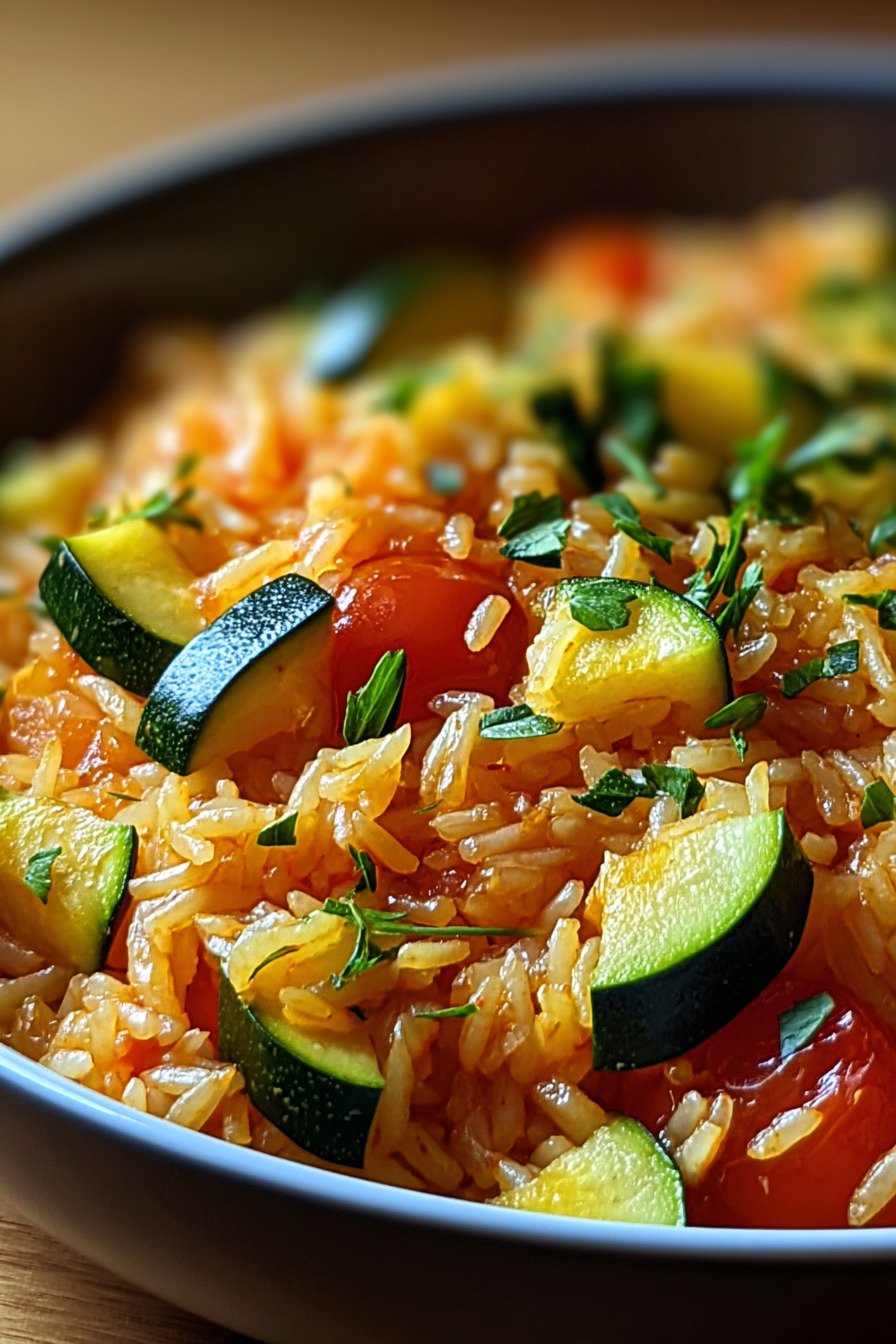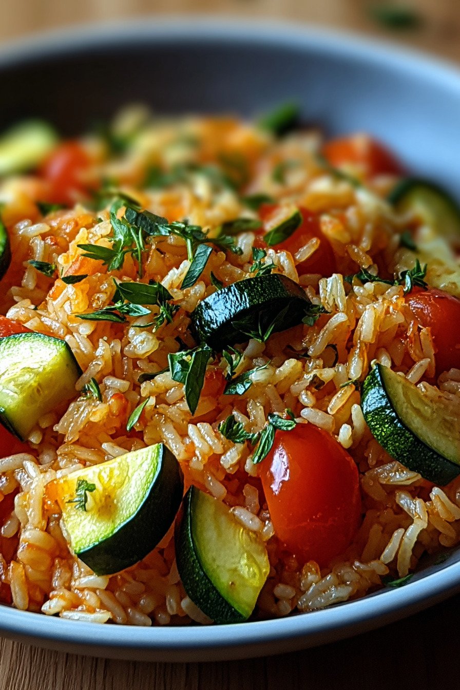 The pan stays simple. Zucchini and tomato meet soft rice. Olive oil brings shine. Garlic lifts the scent. We keep the steps short. We keep the flavor bold and clean.